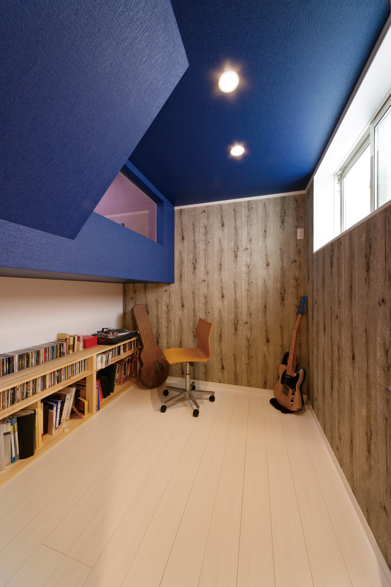 スキップフロア、無垢床リビング、吹抜け、ストリップ階段等々、家族の要望をしっかり形にしながら、構造を支える壁面を計算して開放感ある空間に設計された家。趣味の音楽を楽しむ地下室(音楽室)まで実現した、遊び心を満たした住まい